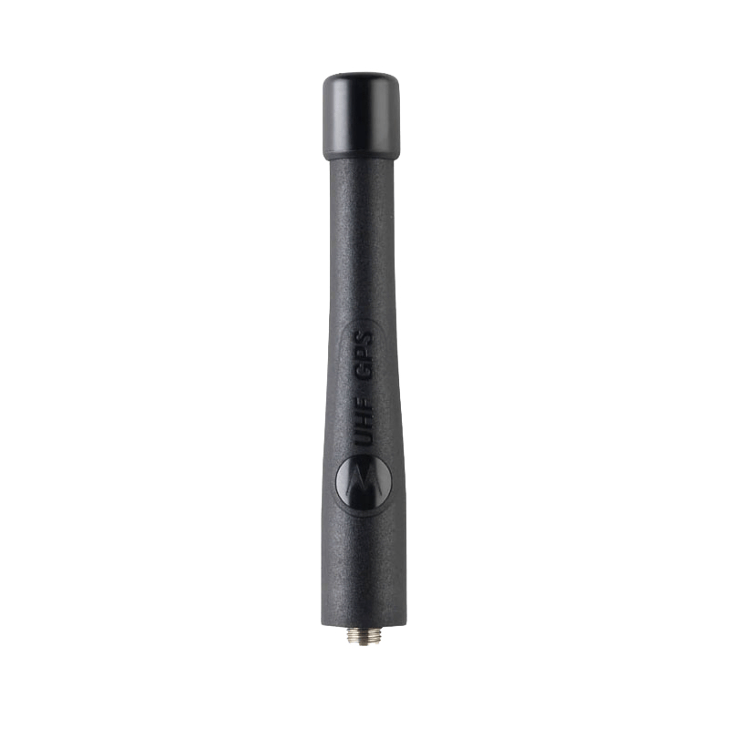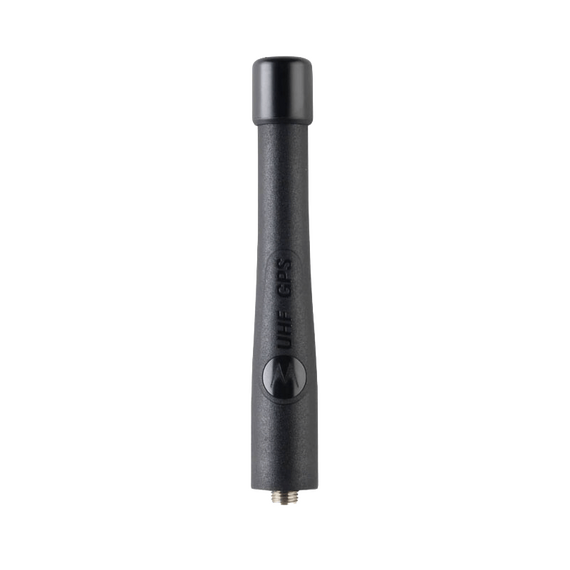 This UHF Range 2 (470-520 MHz) single-band stubby antenna for APX portable radios integrates GPS and is short and unobtrusive when the radio is worn on the belt.