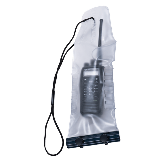 This waterproof bag fits any Motorola two-way radio and includes a convenient carrying strap.