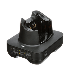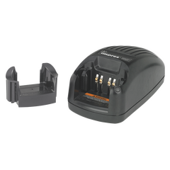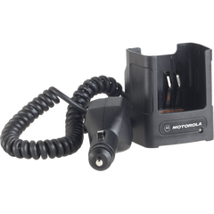 This compact vehicular travel charger allows the radio to be used while rapid-charging in the charger base.