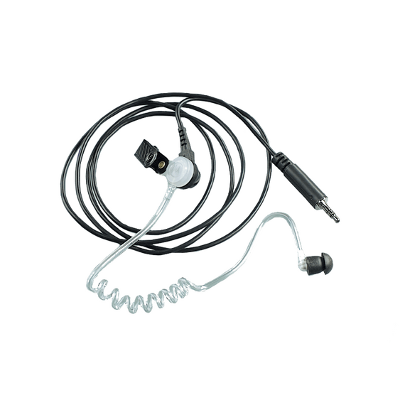 This black surveillance kit includes an extended-wear comfort earpiece with rubber eartip and clear, comfortable acoustic tube. Users hear transmissions clearly on the receive-only earpiece, while the clear tube provides a discreet appearance.