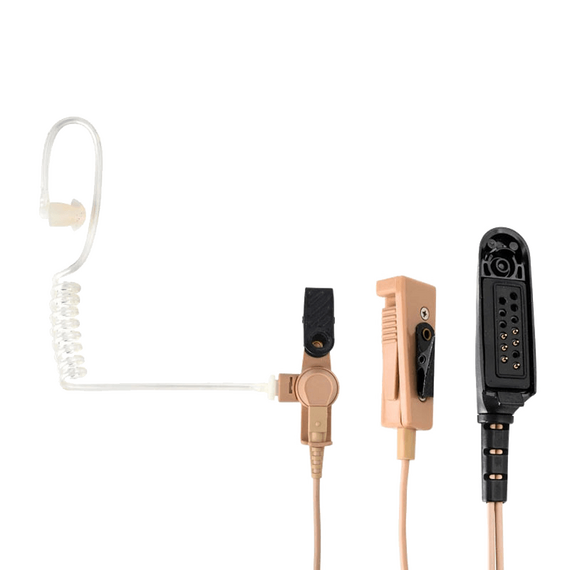 This surveillance kit includes an extended-wear comfort earpiece with rubber eartip and quick-disconnect, clear, comfortable acoustic tube. Users hear transmissions clearly, while the clear tube provides a discreet appearance. This beige, 2-wire kit has a combined microphone and Push-to-Talk feature.
